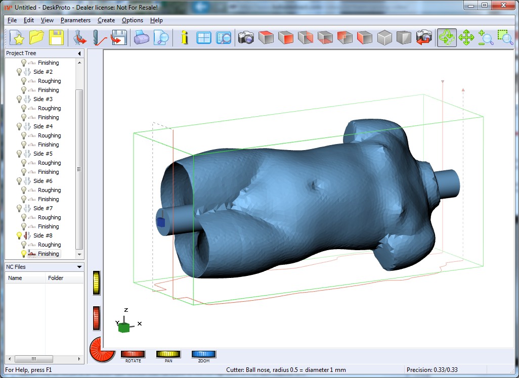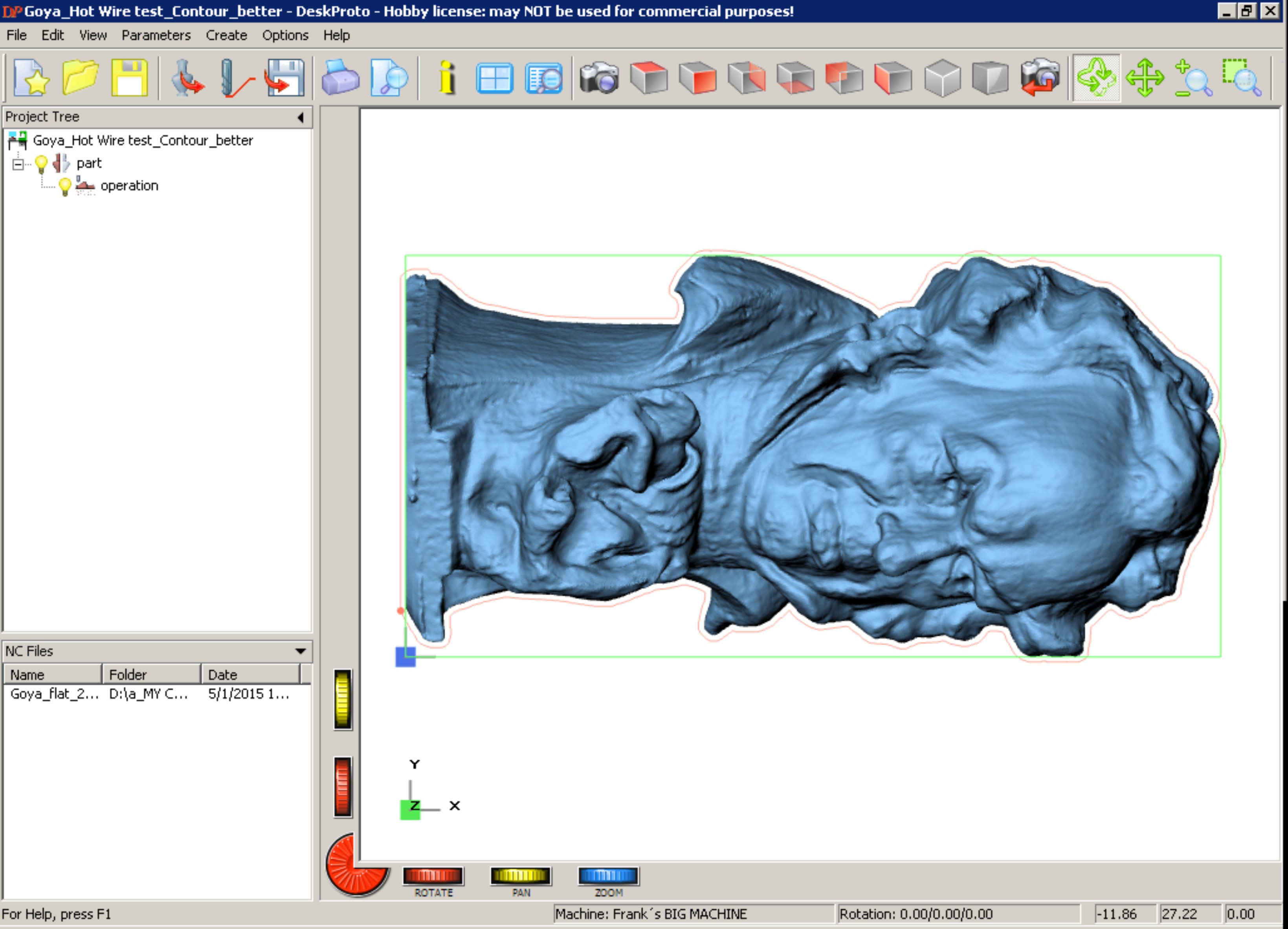 Dear DP friends, I mill polystyrene foam sculptures, using a home built 4 axis milling machine, powered by MACH 3, and using DESKPROTO to generate g/codes from .stl 3 D files. When I do big pieces, the machining times are very long…my record is 22 hours! This is due to the painstaking Roughing stage to remove loads of material before actually getting down to where the 3D form lies and doing what millers are bets at doing. I’ve seen a fabulous application (this is a link to see it in action see http://www.hotwiredirect.com/ ) which combines hot wire trimming of big blocks of foam , and classical milling, all on one machine. A perfect solution! This saves both time and generating enormous piles of foam dust, which is both horrible to work with and costly to eliminate environmentally. So I thought of various ways of achieving what this specialized software does (the company only sell the program together with their machines ;-( ) One approach would be to use DESKROTO to generate a normal X, Y (or A) and Z milling routine*, and then use Excel or a similar program to filter the necessary g-codes, which are only the highest Z values linked to given X values, and eliminate or ignore the superfluous ones, the Y values, as the machine only needs to move along the X axis and up and down the Z axis. *It must be said that if you use this milling g-code routine to move a hot-wire fixture, you run the risk, depending on what Y position you choose, of removing valuable material left or right of that Y position. Check out the image of a bust I upload to get the idea. Which would be a disaster, of course. Another approach would be to look for a “workaround” by configuring for example DESKPROTO with a tool that’s not round in diameter....probably impossible to do at user level!...a tool which is long in the Y axis direction and very short in the X axis…as is a hot wire which moves along the X axis and up down in Z. This would allow DESKPROTO to generate g-codes for the silhouette, or a series of silhouettes, if done say at 45º, 90º, etc etc, on an A axis. So I consulted the guys at the Mach3 Forum, and TP has been very kindly offering ideas out side the box, one of which included consulting DESKPROTO directly, with the problem. Lex kindly advised on a path to follow, which involves using Contour milling to generate the necessary g-codes for hot-wire trimming previous to milling. So I consulted the guys at the Mach3 Forum, and TP has been very kindly offering ideas out side the box, one of which was to use a Contour strategy in DESKPROTO combined with rotary axis milling to generate the codes. But I´ve tried various approaches, all to no avail, and it’s a little above me as to exactly how to achieve this, step by step. Any ideas? |