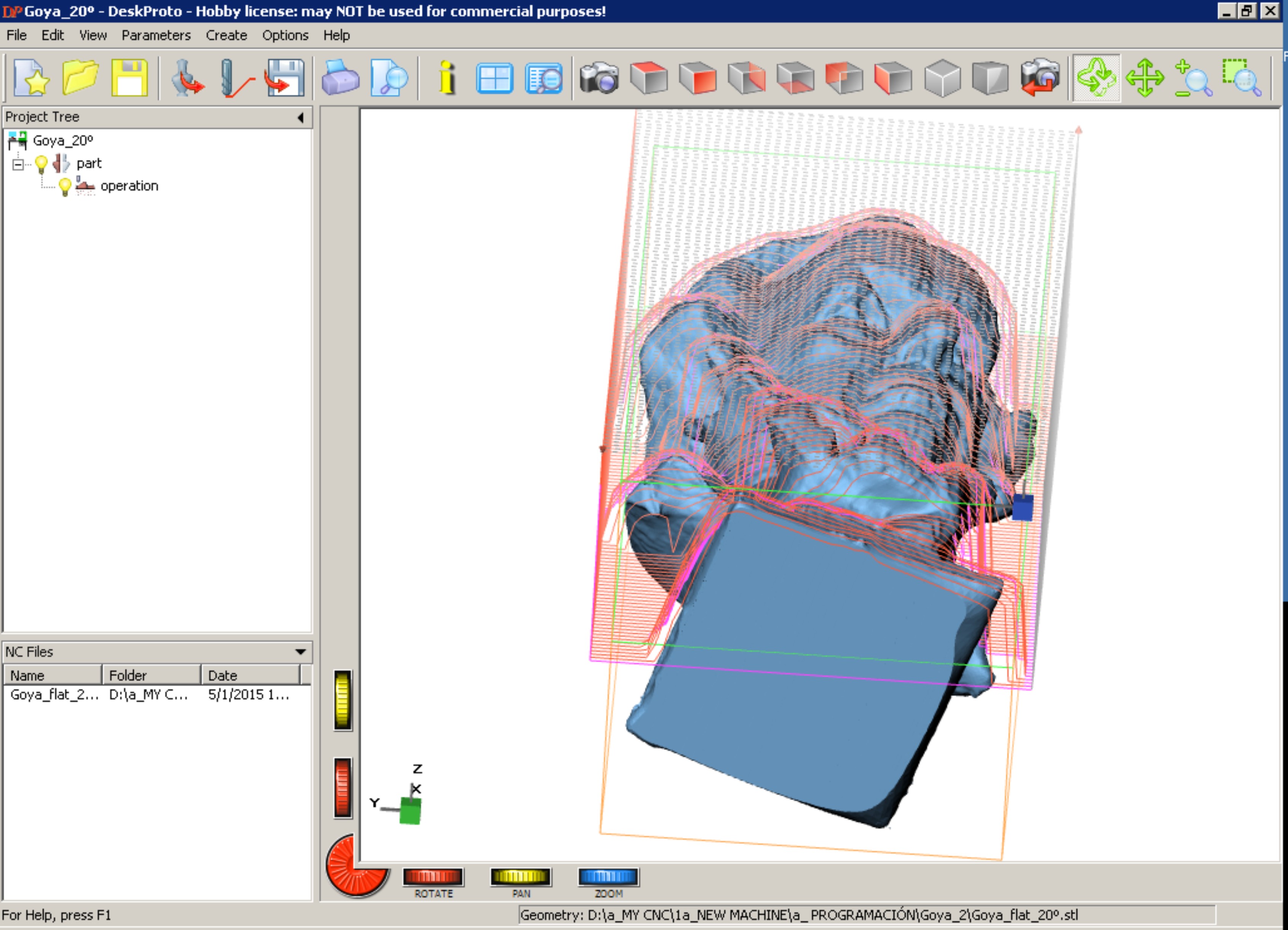 ![]() Progress!! This is a contour path round the exterior-progress made! But I'm still working on how to generate various paths round the figure, as if A axis roary milling. Will keep you all posted! |