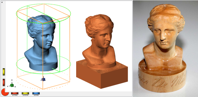 The image above shows the head of Venus de Milo (this STL file is a free download on the DeskProto website). Left a screenshot showing the geometry within a rectangular block (drawn in brown lines). The simulation gives a clear view of the result that can be expected. The result has been machined in wood (American maple) and has been treated with wood oil.